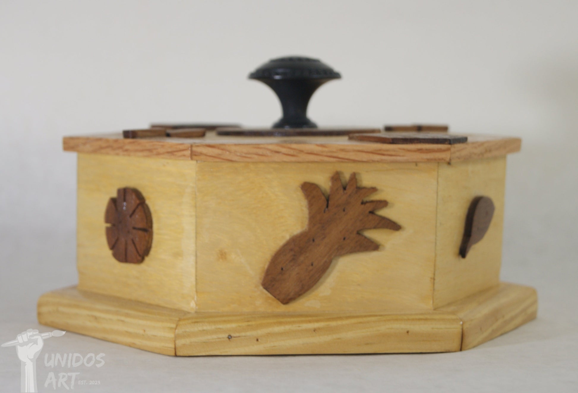 Made with a tropical aesthetic sure to warm any counter top, I crafted this product from the remnants of wood from a previous project in an effort to eliminate waste. Perfect for storing jewelry, guest's keys, or other miscellaneous valuables, this container features a snug top capable of securing its contents. Beautify your personal storage with this decorative container from Crispy Bits.