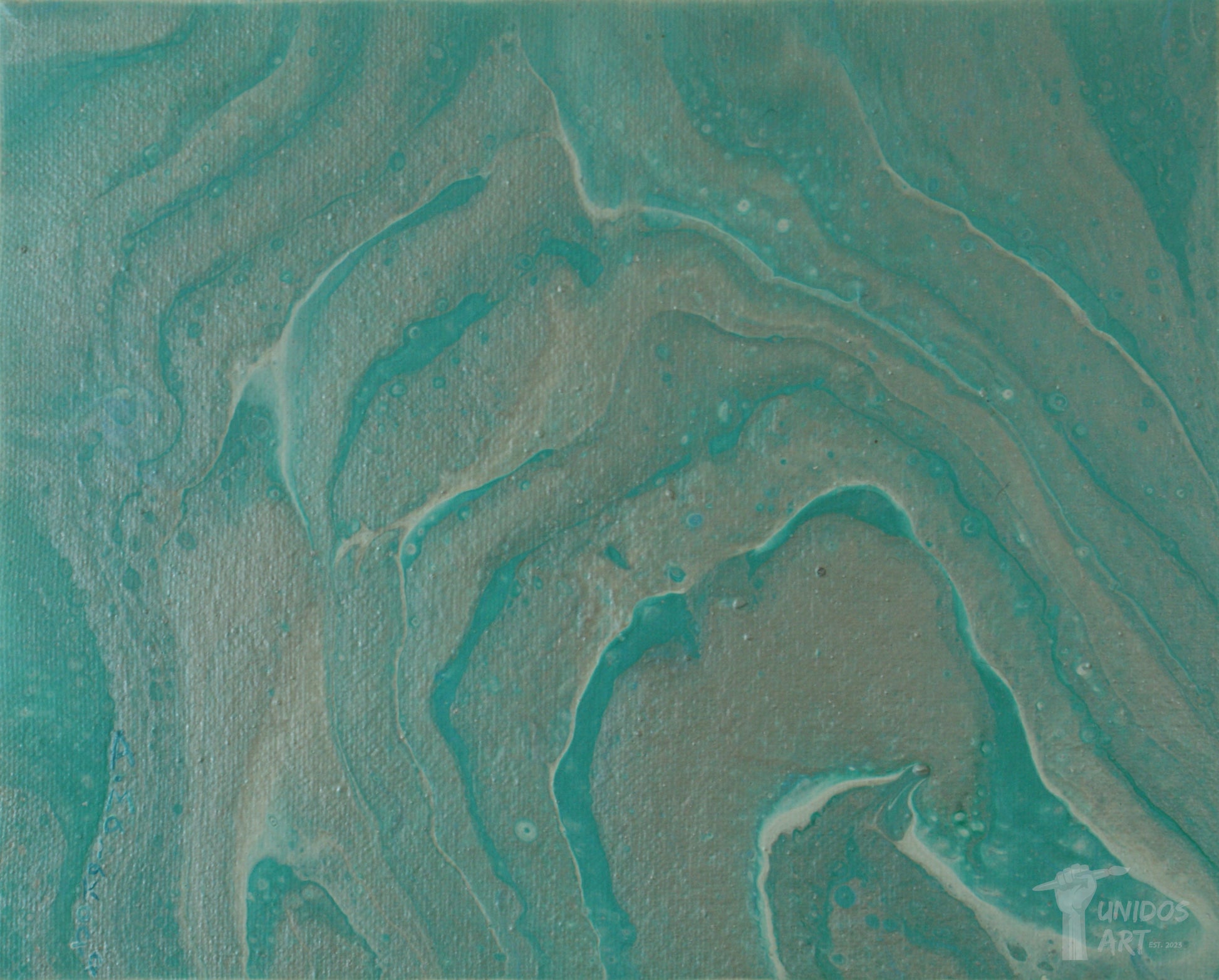 Visualize the clearest, stillest body of water you could imagine. Dip Your Toes imagines that still water just as it erupts into ripples from movement. The simplified palette of white, pale blue-green and silver allows for the striations to lead the piece and create that textured puddle-like effect through thickness in variation. Always be just a step away from calm with Dip your Toes.