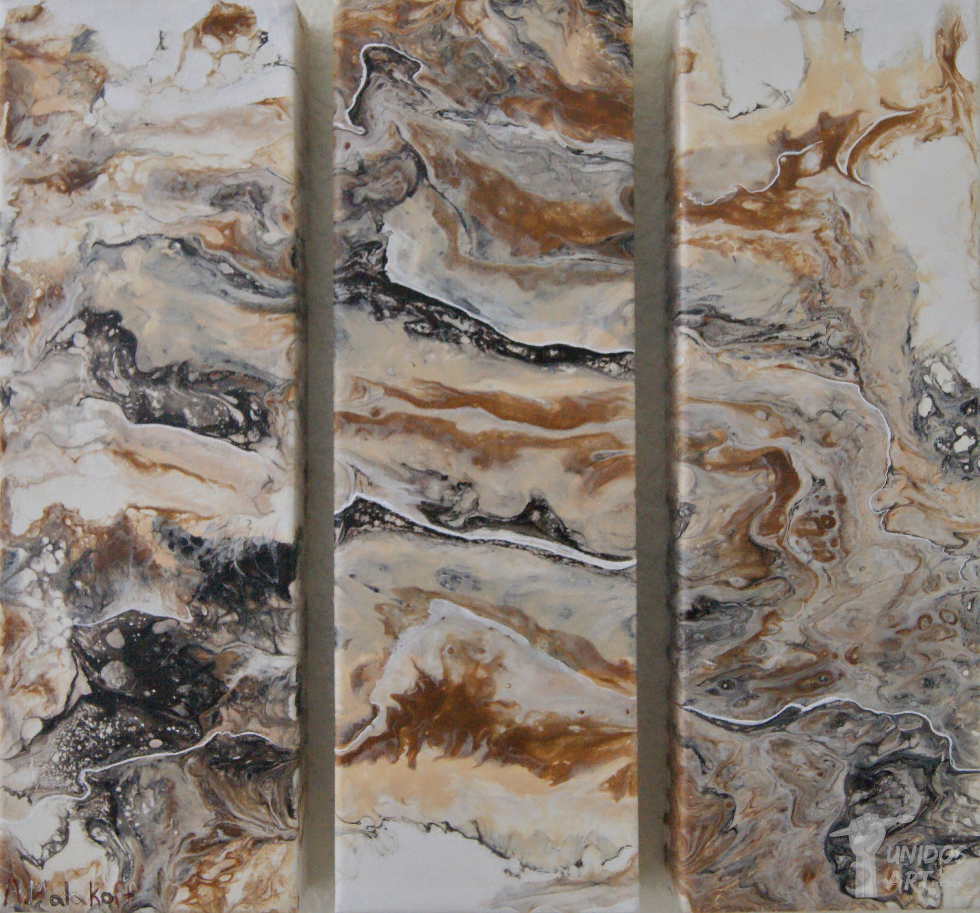 My first triptych blurs color and line to trick viewers into seeing connecting lines and patterns that are not truly there. A neutral palette connects organic shapes, and colors. By embracing action expressionism, I created a conjoined image after experiencing a colossal setback when two wet canvases fell into each other mid-pour. Murphy's Law embodies its adage, "anything that can go wrong, will go wrong".
