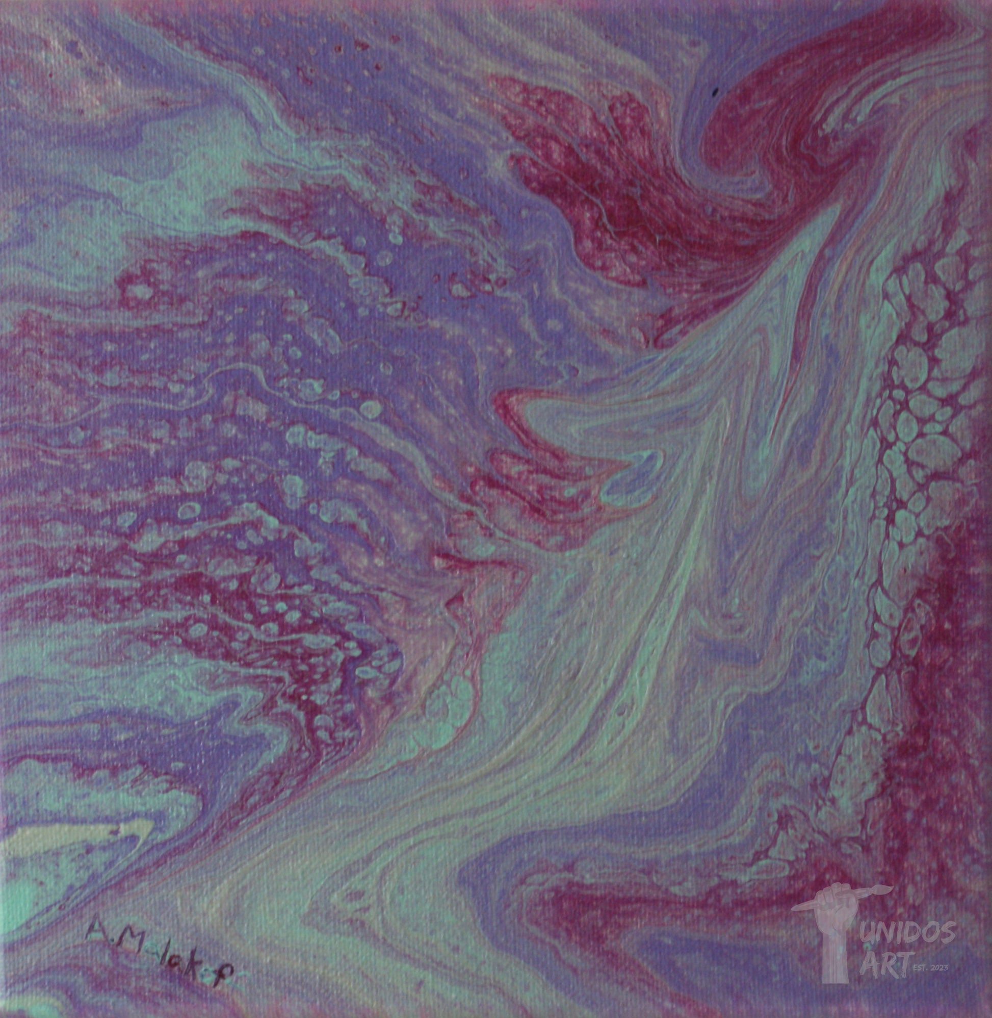 Some of my all-time favorite colors are analogous, such as red-violet, violet, and blue-violet, a palette that inspired Phlox River Flows. Utilizing a dirty pour variation, I pulled the cup up slowly and dragged it across the canvas to form multiple lines in an ebb and flow. I encourage you to flow the stream wherever your eyes lead you, as they encourage equilibrium.