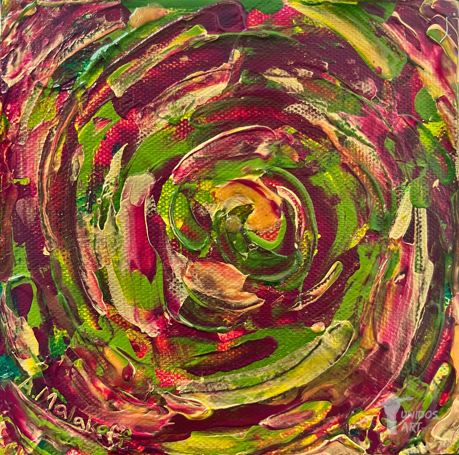 Get sucked into Swirlpool, an impasto exploration of the complementary relationship between yellow-green and red-violet. Yellow-gold additions brighten up the canvas, cycling the viewer around and around again. I encourage you to be inspired and find new details with every spiral.Couldn't load pickup availability